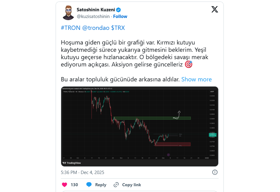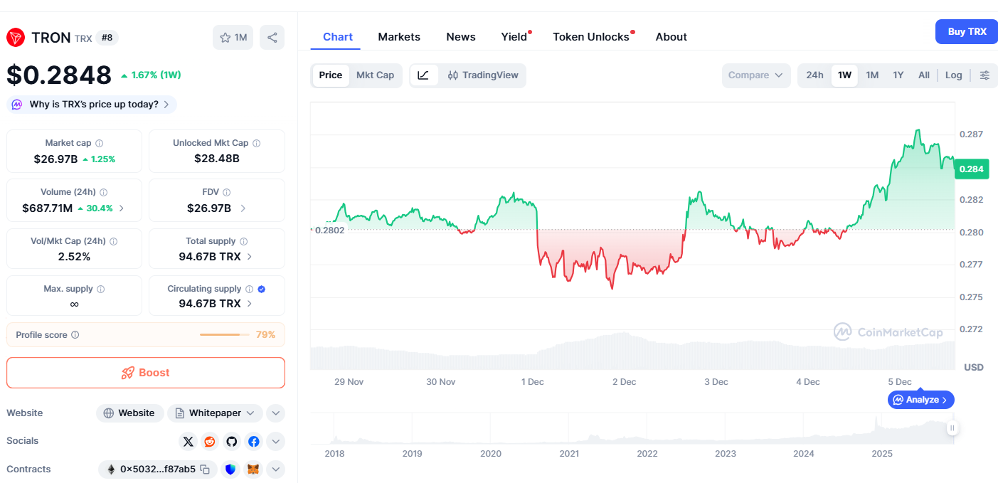 Volgens gegevens van CoinMarketCap is de prijs van Tron doorgestoten tot de $0,2850-zone. Bulls proberen momenteel deze voormalige weerstandszone om te zetten in een steunniveau.