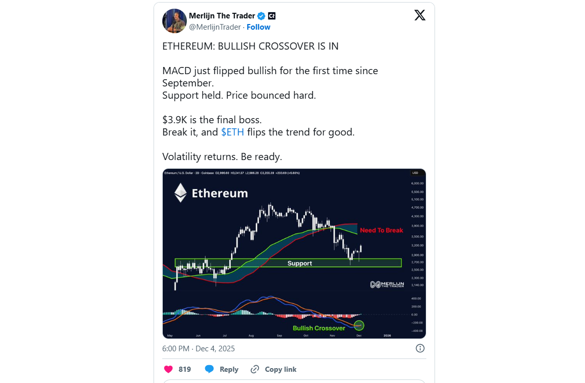 Ondertussen liet MerlijnTrader zijn volgers weten dat er een bullish crossover is gevormd op de Ethereum-grafiek, wat ETH op dit moment een interessante aankoop maakt.