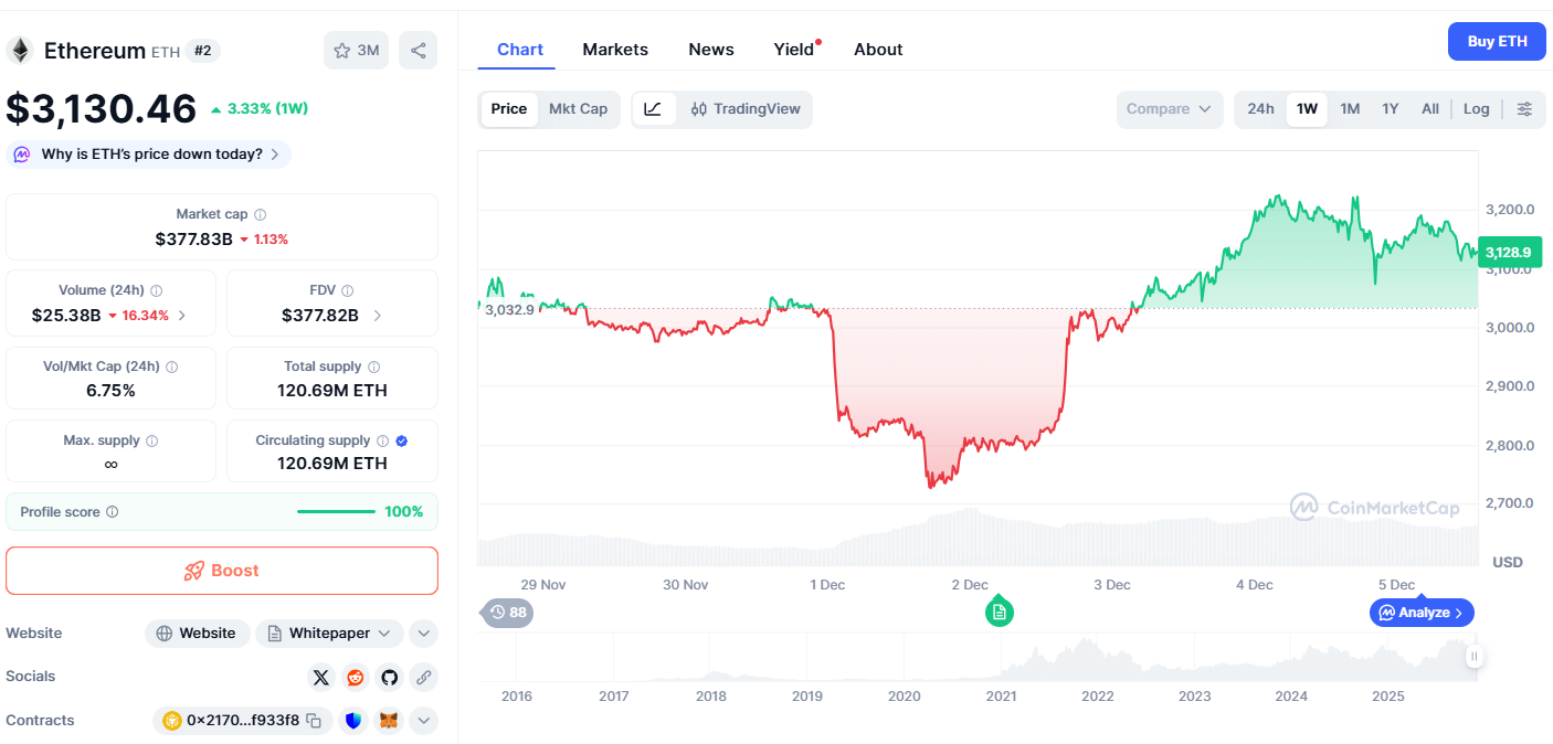 Volgens CoinMarketCap is de prijs van Ethereum op weekbasis met 3,3% gestegen. Toch is er nog geen sprake van een echte rally na de recente Fusaka-upgrade.