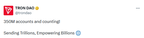 Hij voorspelt dat de prijs van Tron flink kan stijgen als het de grens van $0,31 doorbreekt. In een andere tweet stelde Umair Crypto dat de Tron-prijs eerst de weerstand rond $0,285 moet doorbreken om door te kunnen stijgen naar $0,31. In ander nieuws heeft Tron inmiddels 350 miljoen accounts overschreden, een teken van aanhoudende groei door de jaren heen.