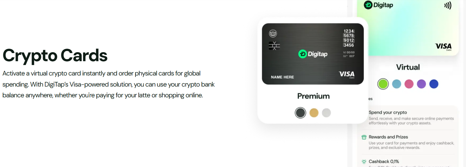 Digitap krijgt ook bekendheid vanwege zijn unieke wereldwijde geldapp. Het project heeft een app gelanceerd waarmee gebruikers toegang krijgen tot aangepaste, fysieke of virtuele cryptokaarten die ondersteund worden door Visa. Met integratie van Apple Pay en Google Pay kunnen deze kaarten gebruikt worden om online of lokaal aankopen te doen.