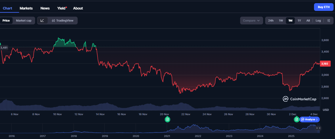 Ethereum vertoont de afgelopen weken enige volatiliteit. CoinMarketCap laat zien dat de ETH-prijs op de weekgrafiek is gestegen van ongeveer $3.000 naar bijna $3.200. Tegelijkertijd toont de grafiek dat de Ethereum-waarde in de afgelopen 30 dagen met bijna 10% is gedaald.