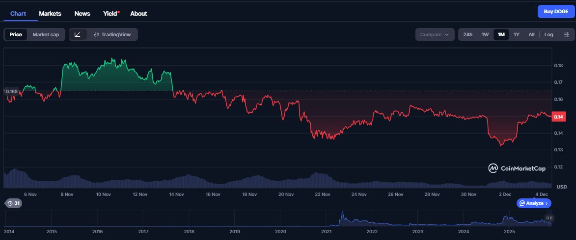Hoewel Dogecoin een van de top 10 altcoins blijft om te kopen, vertoont het ook rode cijfers op de prijsgrafieken. Op de maandgrafiek daalde de prijs van Dogecoin van ongeveer $0,16 naar onder de $0,15, aldus CoinMarketCap. Dat betekent een daling van bijna 10% in één maand.