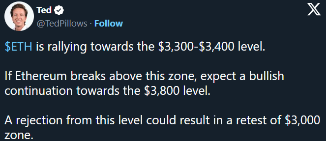 Toch denkt influencer Ted dat deze opwaartse trend voor Ethereum zal doorzetten. Volgens een bericht op X kan de ETH-prijs een bullish voortzetting richting $3.800 meemaken als hij door de weerstand van $3.300 of $3.400 breekt. Als dat niet lukt, kan Ethereum terugvallen naar de $3.000-zone.
