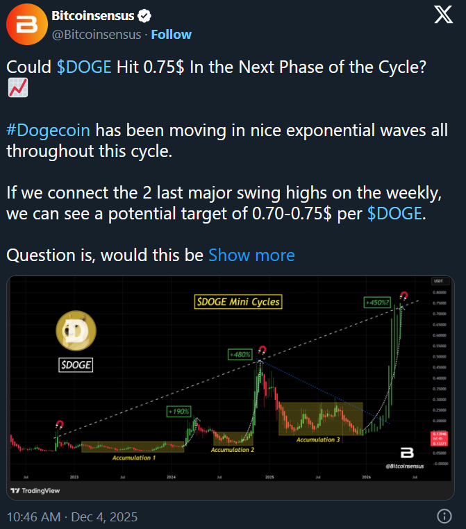 Toch blijft men deze token nauwlettend volgen dankzij een optimistische Dogecoin-prijsvoorspelling van influencer Bitcoinsensus. In een recent X-bericht vertelt hij zijn volgers dat deze memecoin momenteel beweegt in mooie exponentiële golven. Als je de laatste twee belangrijke swing highs op de weekgrafiek verbindt, zou de prijs van Dogecoin binnenkort $0,75 kunnen bereiken.