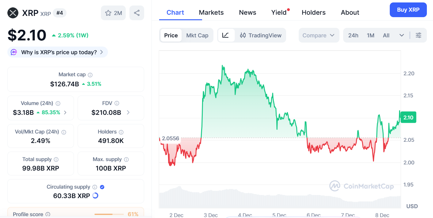 Deze snelle opleving volgde op het bullish nieuws dat Vanguard zich op crypto richt door meerdere crypto ETF’s, waaronder XRP, te noteren. De opwinding over deze ontwikkeling verdween echter snel, en XRP begon zijn winst weer in te leveren. Op 8 december was XRP gestabiliseerd rond de $2,10.