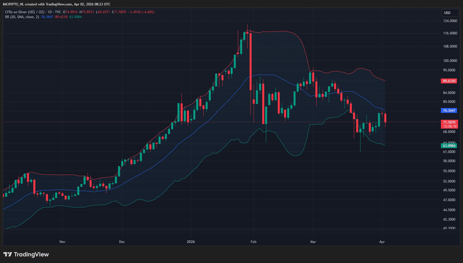 Zilver heeft een grotere val gemaakt met een totaal verlies van net geen 7,80 procent. De prijs ging van 75,51 dollar naar een bodem van 68,58 dollar en staat inmiddels op 71,40 dollar.