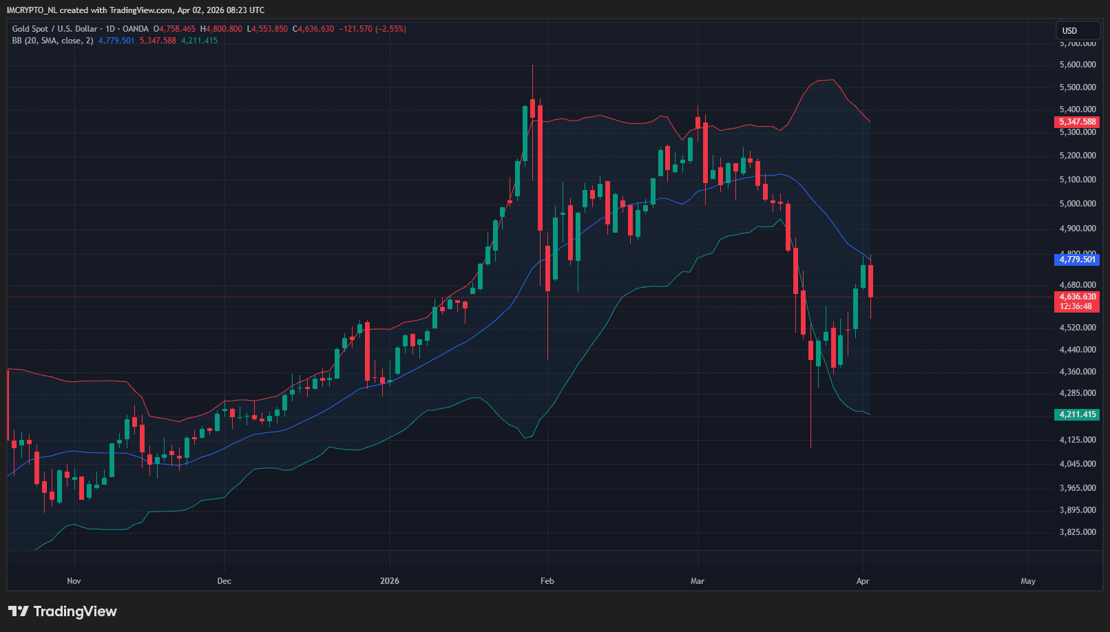 De goudprijs is in totaal met ruim 4,80 procent gedaald, van 4.786 dollar per troy ounce (dat is iets meer dan 31 gram) naar een dieptepunt van 4.553 dollar. Vanmorgen is het wel weer sterk opgeveerd en momenteel gaat het voor 4.645 dollar over de toonbank. Daarmee staat er een verlies van 2,40 procent op de borden.