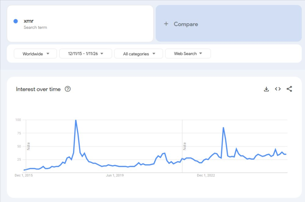 Opvallend is dat de stijging niet gepaard gaat met een sterke toename van publieke belangstelling. Volgens gegevens van Google Trends blijft de zoekinteresse naar Monero al jaren relatief stabiel. De koersontwikkeling lijkt daarmee vooral te worden gedreven door handelaren en investeerders, niet door een bredere hype onder het grote publiek.
