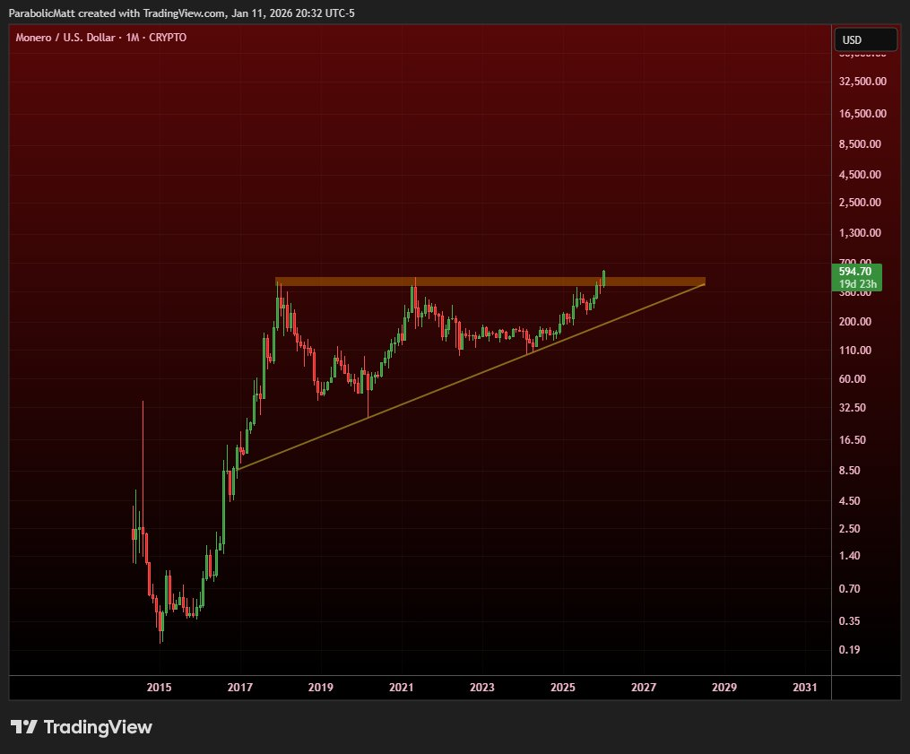 Volgens crypto-analist Matthew Hyland is er bovendien sprake van een belangrijke technische doorbraak. Hij meldde op X dat Monero onlangs een zogenoemde stijgende driehoek heeft doorbroken, een patroon dat zich over een periode van ongeveer tien jaar heeft gevormd.