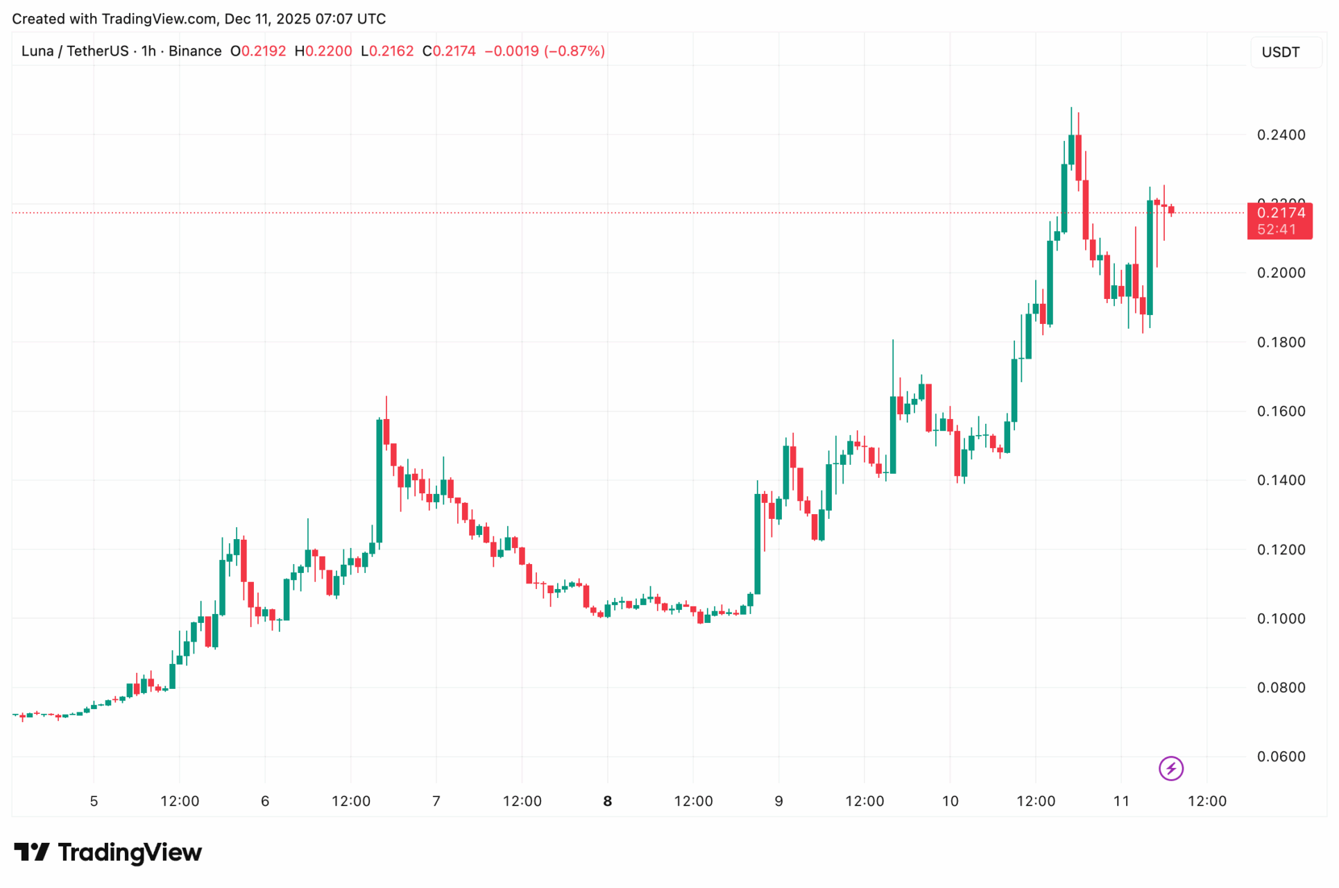 LUNA stond dinsdagochtend op ongeveer 0,22 dollar, een stijging van 46 procent in slechts één dag. Daarmee zet de munt zijn opvallende comeback voort. In een week tijd is de koers bijna verdrievoudigd, terwijl het project nog geen twee maanden geleden op crypto-Twitter werd afgeschreven als verloren zaak.