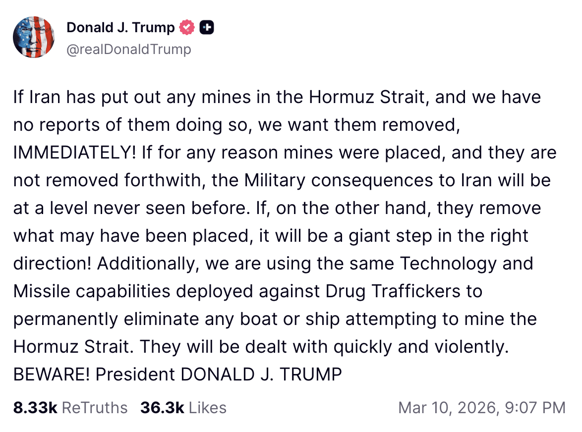 Trump zelf reageerde eerder via Truth Social met een duidelijke waarschuwing. Als Iran daadwerkelijk mijnen heeft geplaatst en deze niet verwijdert, zal het land volgens hem gevolgen ondervinden “op een niveau dat nog nooit eerder is vertoond”.