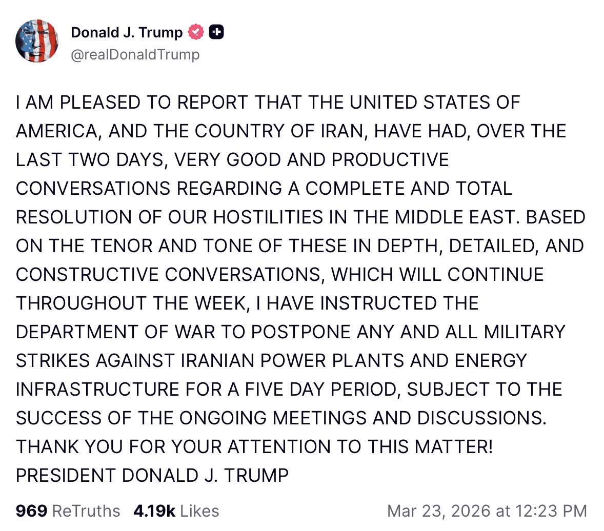 President Donald Trump heeft aangekondigd dat gesprekken met Iran “productief” zijn verlopen en militaire aanvallen voorlopig worden uitgesteld. De reactie op de markten is direct zichtbaar: de olieprijs daalt scherp en de Bitcoin koers krijgt ruimte om te herstellen.