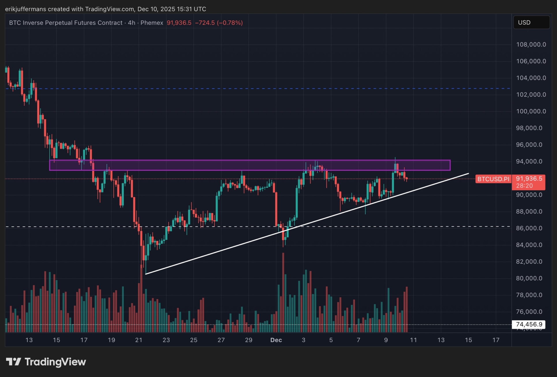 We zien dat de koers de afgelopen paar weken meerdere malen werd afgewezen op het weerstandsniveau (paars) tussen 93.000 en 94.000 dollar. Ook gisteren gebeurde dit, voor de vijfde keer. Elke keer zien we dat de correctie minder diep is. Op deze manier vormt er een opwaarts driehoek-patroon. Een bullish patroon.