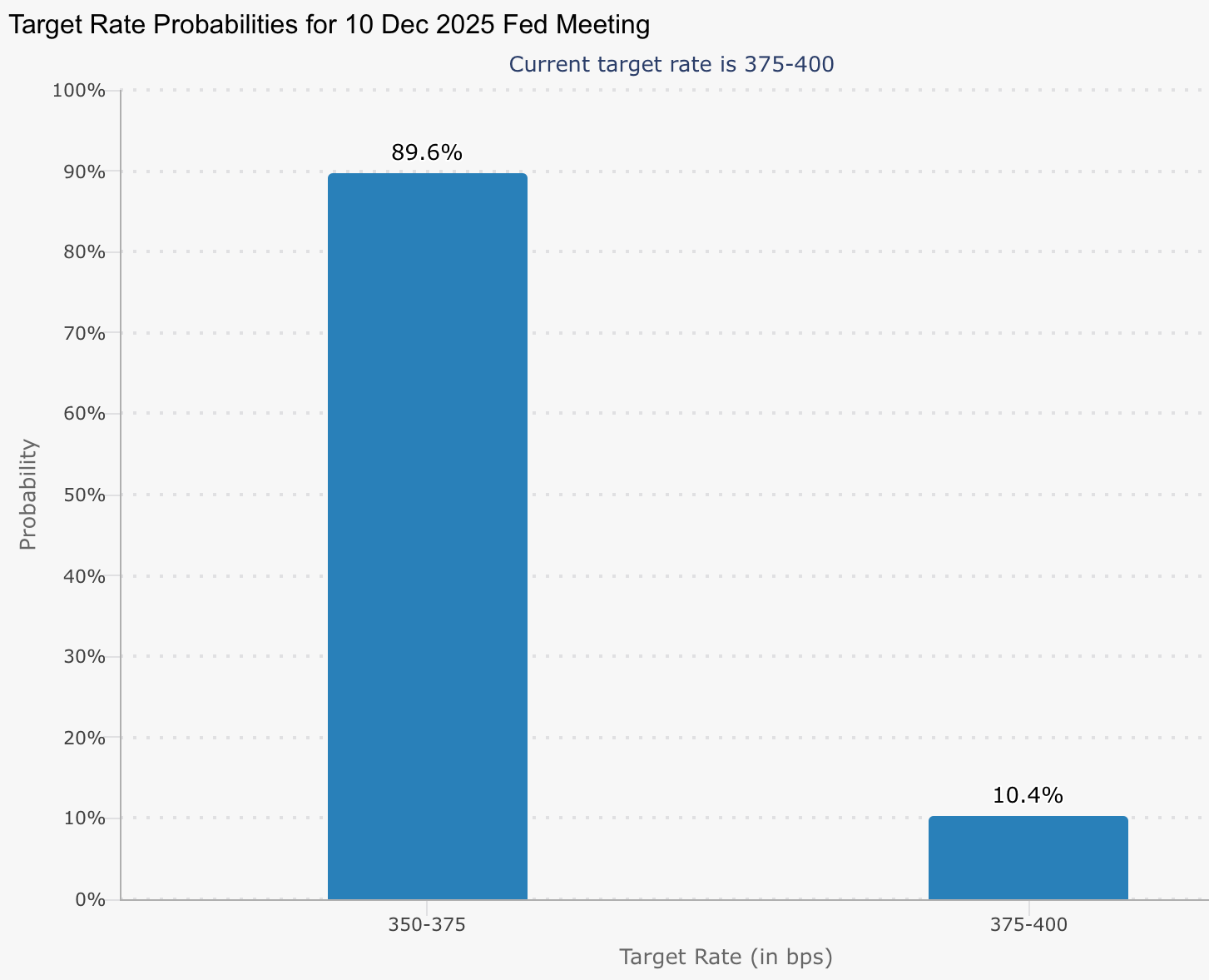 Ook voor de cryptomarkt is het Amerikaanse macro-economische beleid van groot belang. Volgens de FedWatch Tool van CME is de kans op een renteverlaging van 25 basispunten opgelopen tot bijna 90 procent, wat zou neerkomen op de derde verlaging dit jaar. Deze renteverlaging is dus ook al grotendeels opgenomen in de koersen.