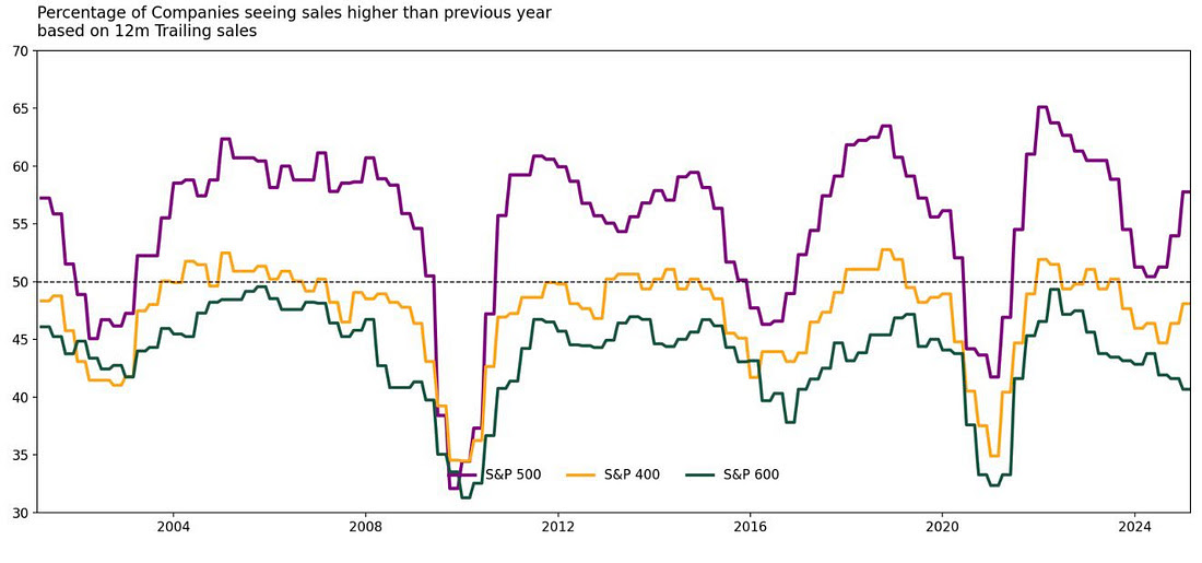 Bijna 60 procent van de grote bedrijven in de S&P 500 zag de omzet stijgen ten opzichte van een jaar geleden. Bij middelgrote bedrijven ligt dat rond de 50 procent (S&P 400). Alleen bij kleinere bedrijven (S&P 600) blijft de trend zwakker, waarschijnlijk omdat zij gevoeliger zijn voor de hogere rentes van de afgelopen jaren.