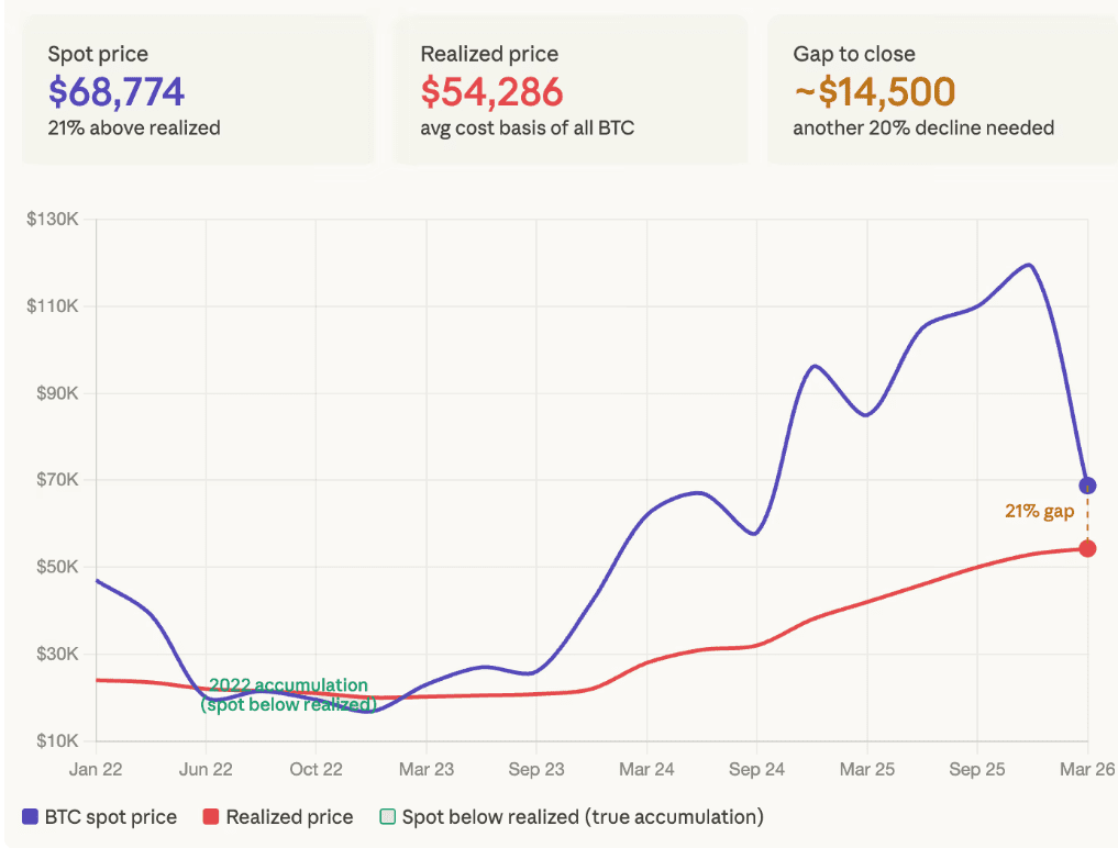 De afstand tussen de huidige Bitcoin koers en de zogenoemde realized price krimpt in een rap tempo. De realized price is de gemiddelde aankoopprijs van alle Bitcoins op het netwerk, gewogen naar hun laatste transactie. Simpel gezegd: het laat zien hoeveel de gemiddelde houder heeft betaald.