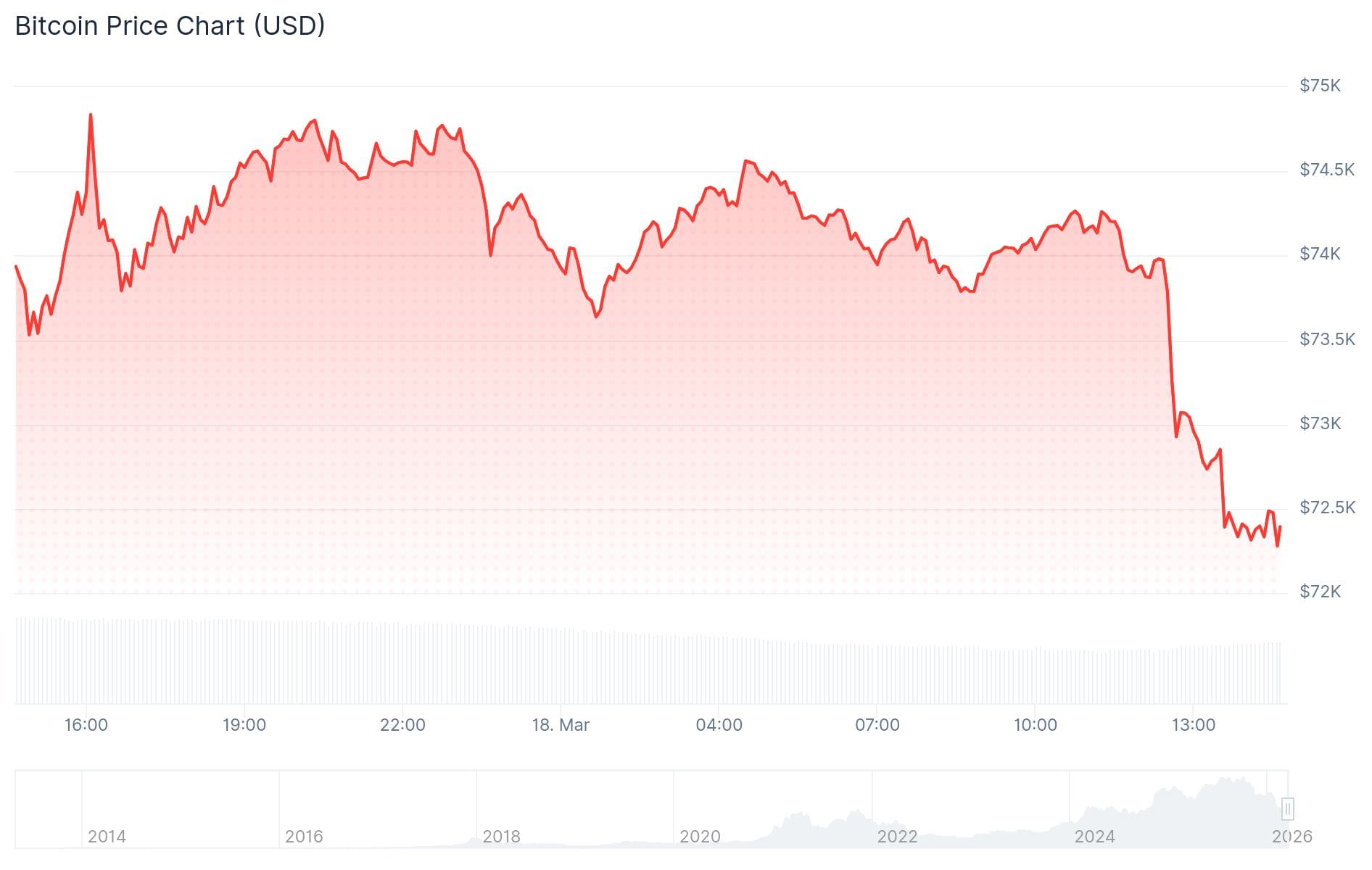 De Bitcoin koers is in minder dan twee uur tijd met 2,5 procent gedaald. Van 74.000 dollar rond 12:30 uur naar een dieptepunt van 72.150 dollar.