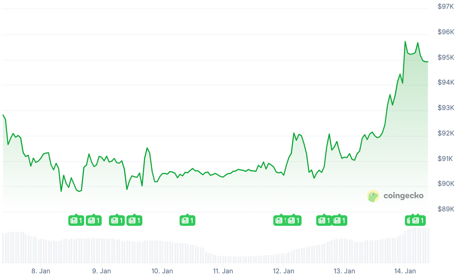 De Bitcoin koers is de afgelopen 24 uur met 3,4 procent gestegen. Rond middernacht verscheen de 96.000 dollar op de koersborden, voor het eerst sinds 16 november.