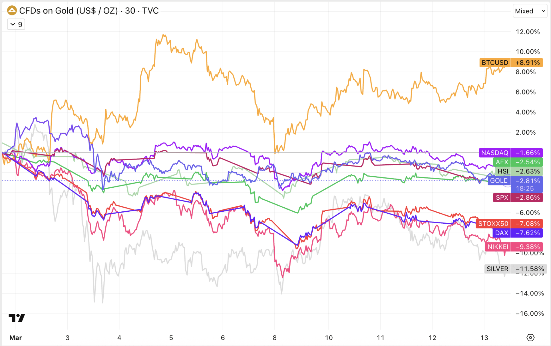 Wat dat betreft lijkt er geen peil op te trekken. Net nadat de Verenigde Staten en Israël de aanval openden op 28 februari, schoot goud nog van 5.296 naar 5.423 dollar per ounce.