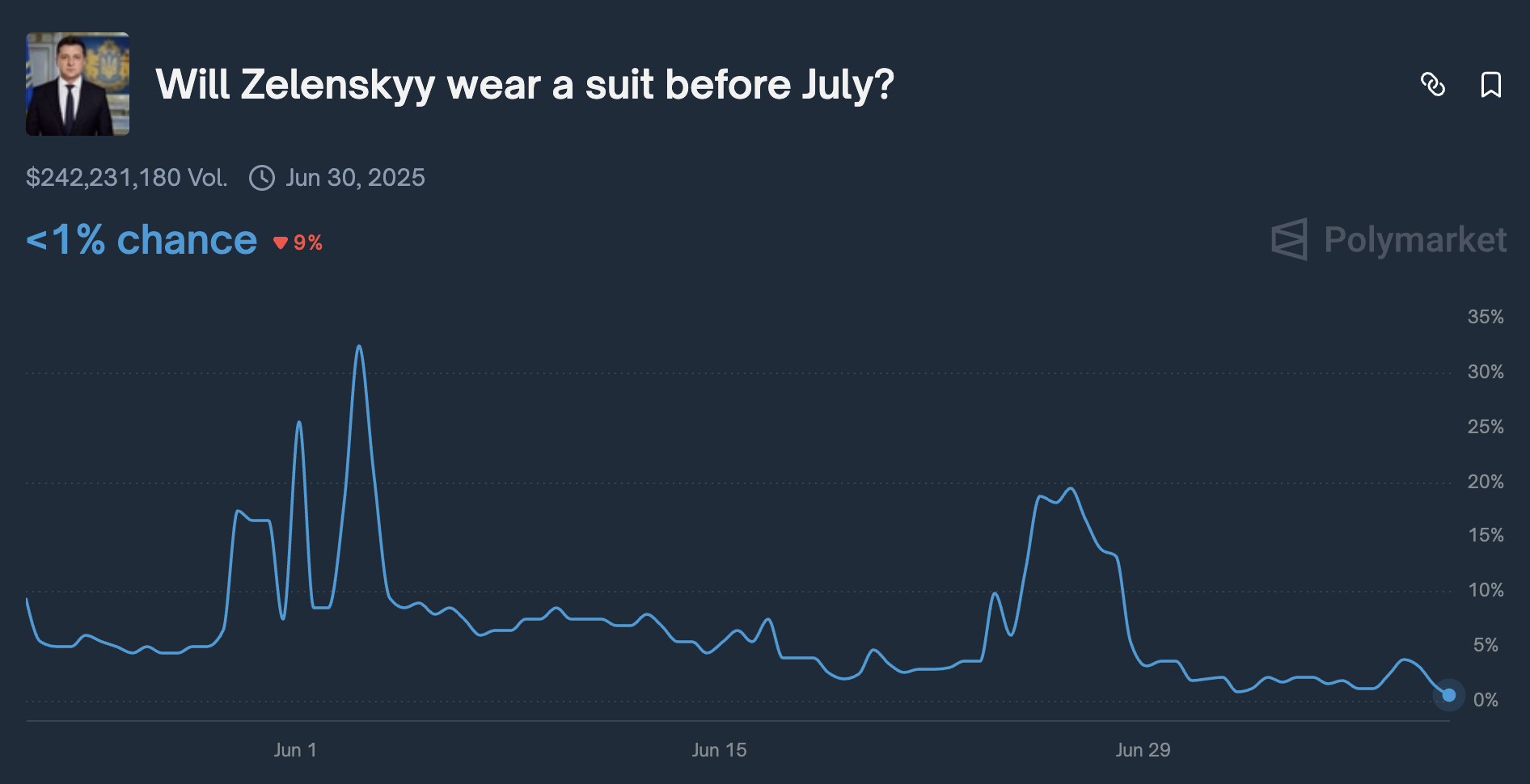 De weddenschap op het populaire voorspellen-platform Polymarket vroeg of Zelensky tussen 22 maart en 30 juni op beeld zou verschijnen in een pak. In totaal werd er meer dan 242 miljoen dollar verhandeld. Op 24 juni verscheen Zelensky tijdens een NAVO-bijeenkomst in Nederland in een zwart jasje, pantalon en overhemd. Volgens meerdere internationale media was dit een pak.