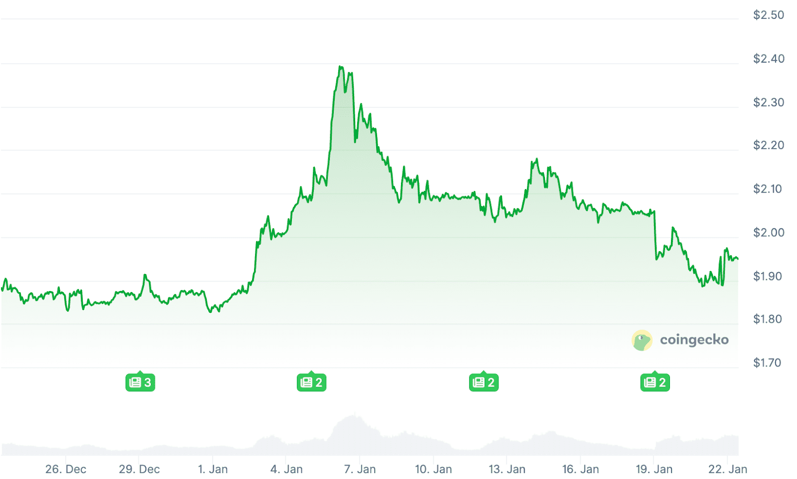 Net voor de jaarwisseling, op 19 december, stond XRP nog op een koers van bijna 1,75 dollar, het laagste niveau sinds april 2025. Kort daarna begon een opwaartse beweging, met een piek van 2,42 dollar begin januari. Op het moment van schrijven staat XRP rond de 1,95 dollar.