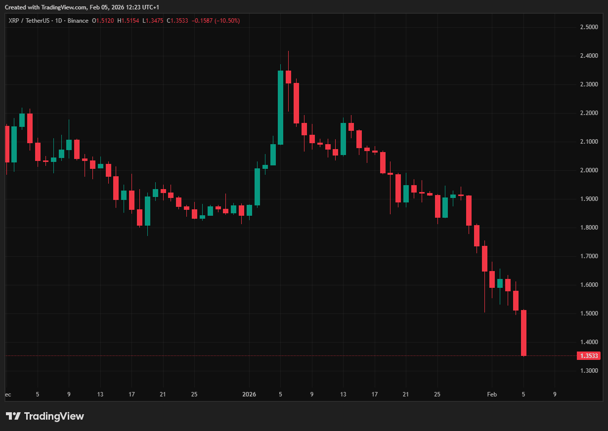 De scherpe daling past in een bredere correctie op de cryptomarkt, maar XRP wordt opvallend hard geraakt. De munt presteert momenteel zelfs slechter dan andere grote altcoins.