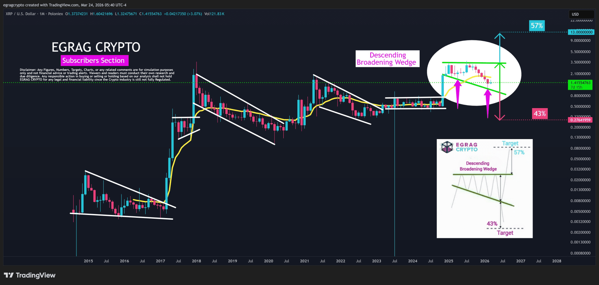Volgens EGRAG CRYPTO beweegt XRP zich al sinds juli 2025 in een zogenoemde descending broadening wedge. Dat is een technisch patroon waarbij de koers steeds lagere toppen en lagere bodems vormt, maar het bereik steeds breder wordt. Zulke patronen gaan vaak vooraf aan een grote uitbraak, omhoog of omlaag.