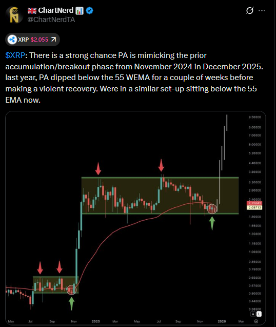 XRP beweegt namelijk al ruim een jaar binnen een brede koersrange. En diezelfde fase zagen we ook in 2024, vlak voordat de bizarre stijging van november losbarstte.