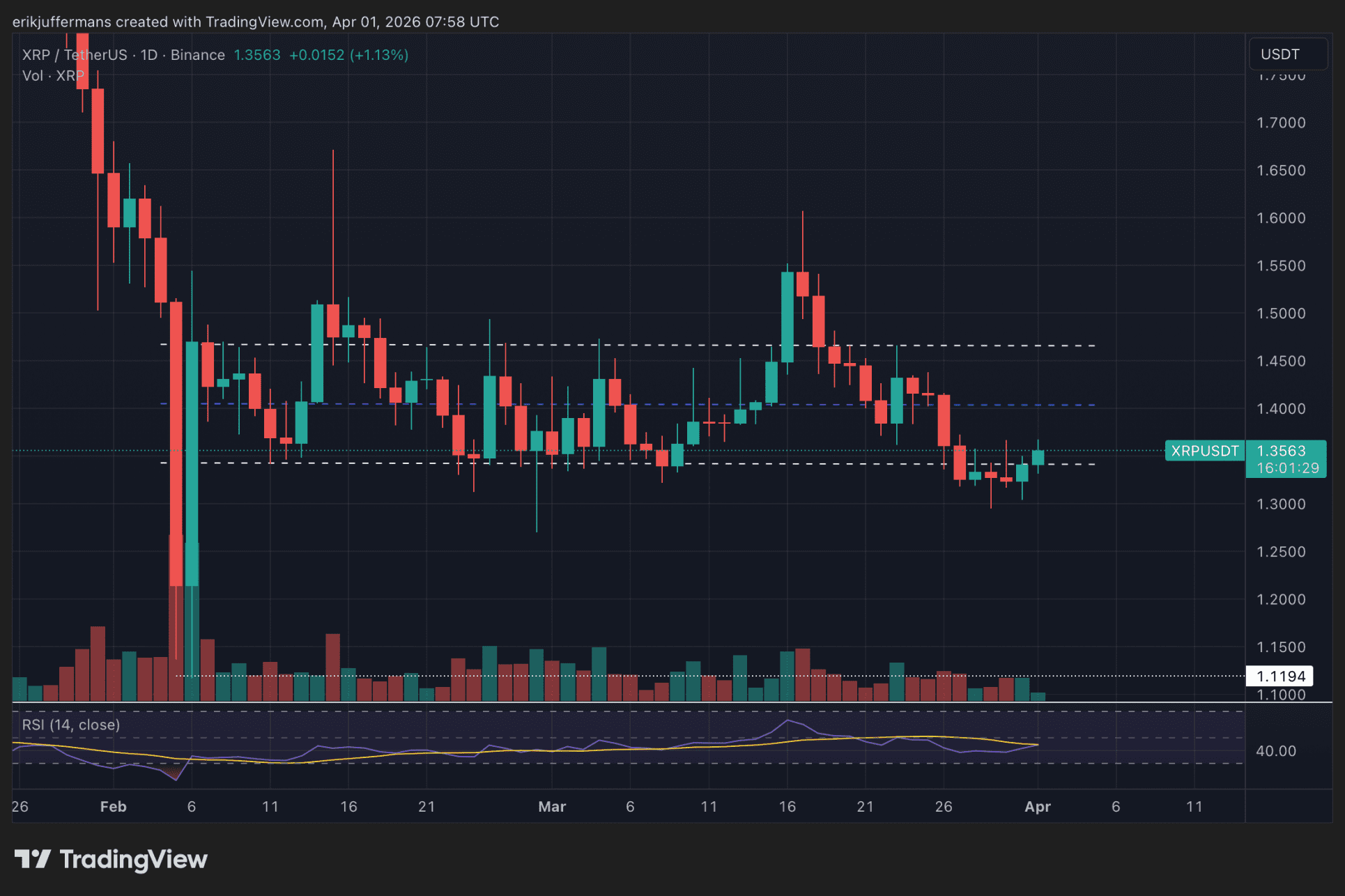 De XRP koers bereikte twee weken geleden nog een piek van 1,60 dollar. Sindsdien leverde de munt vrijwel de volledige winst weer in en zakte de koers zelfs onder de 1,30 dollar. Inmiddels is er sprake van een kleine opleving.