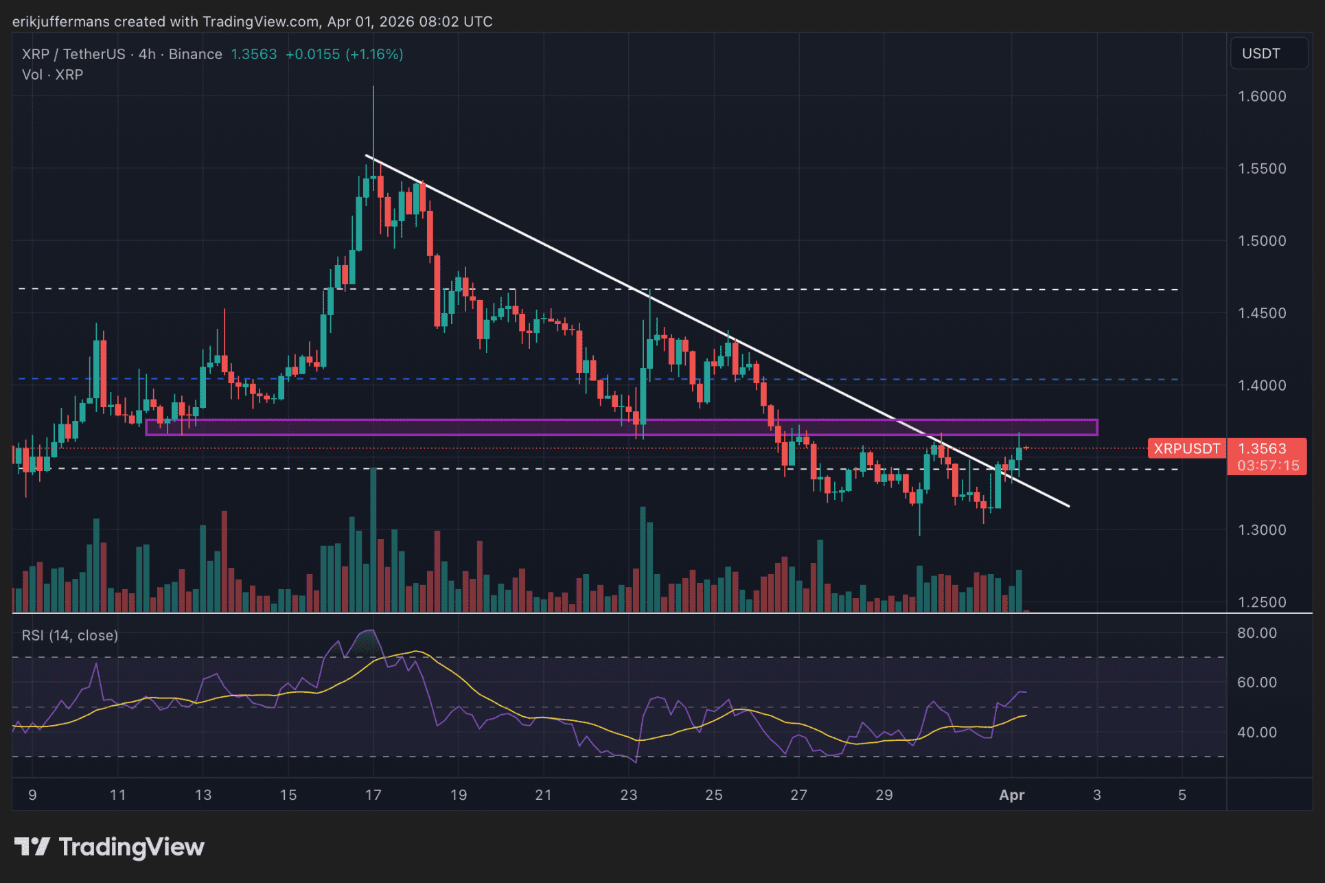 Op de vieruursgrafiek ziet Juffermans meer hoopvolle signalen. De koers brak door een dalende weerstandslijn, wat duidt op afnemende verkoopdruk. Wel stuit XRP nu op een horizontale weerstand. Als de munt daar doorheen breekt, komt volgens hem een stijging richting 1,50 dollar in beeld.