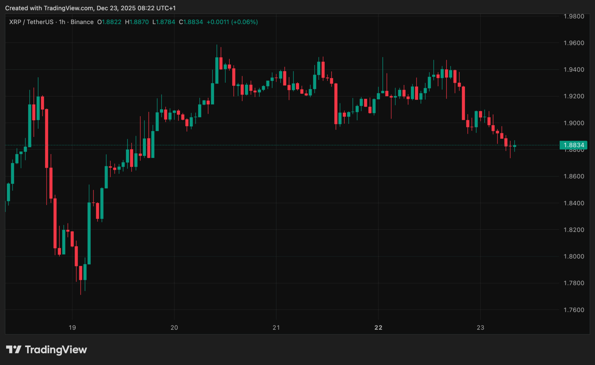 In de afgelopen 24 uur daalde de koers van XRP met ongeveer twee procent, van 1,93 naar 1,88 dollar. De poging om door de weerstand van 1,95 dollar te breken mislukte, wat leidde tot een terugval. De volatiliteit bleef echter beperkt wat duidt op onzekerheid in plaats van paniek.