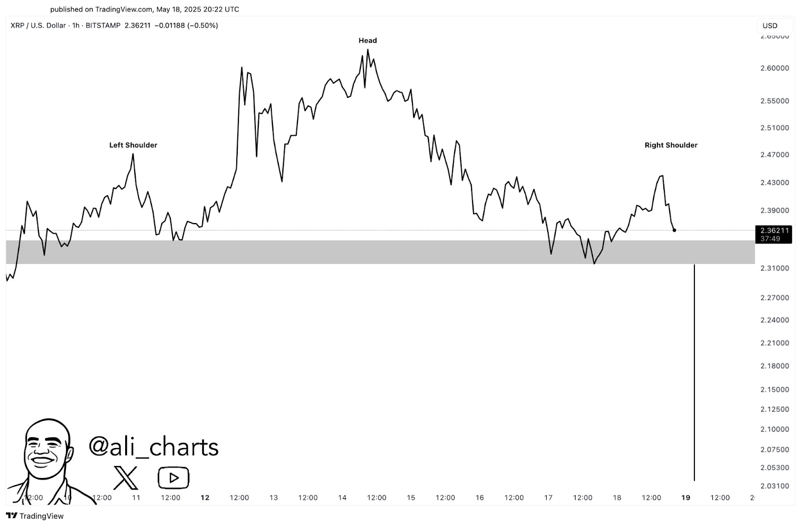Op de 1-uursgrafiek tekent zich een klassiek hoofd-en-schouderspatroon af — een patroon dat vaak wijst op een trendomslag. Volgens analist Ali Martinez ligt de neklijn rond de $2,30, een niveau dat XRP momenteel serieus op de proef stelt. Een doorbraak onder deze grens zou de deur kunnen openen naar een daling richting $2.