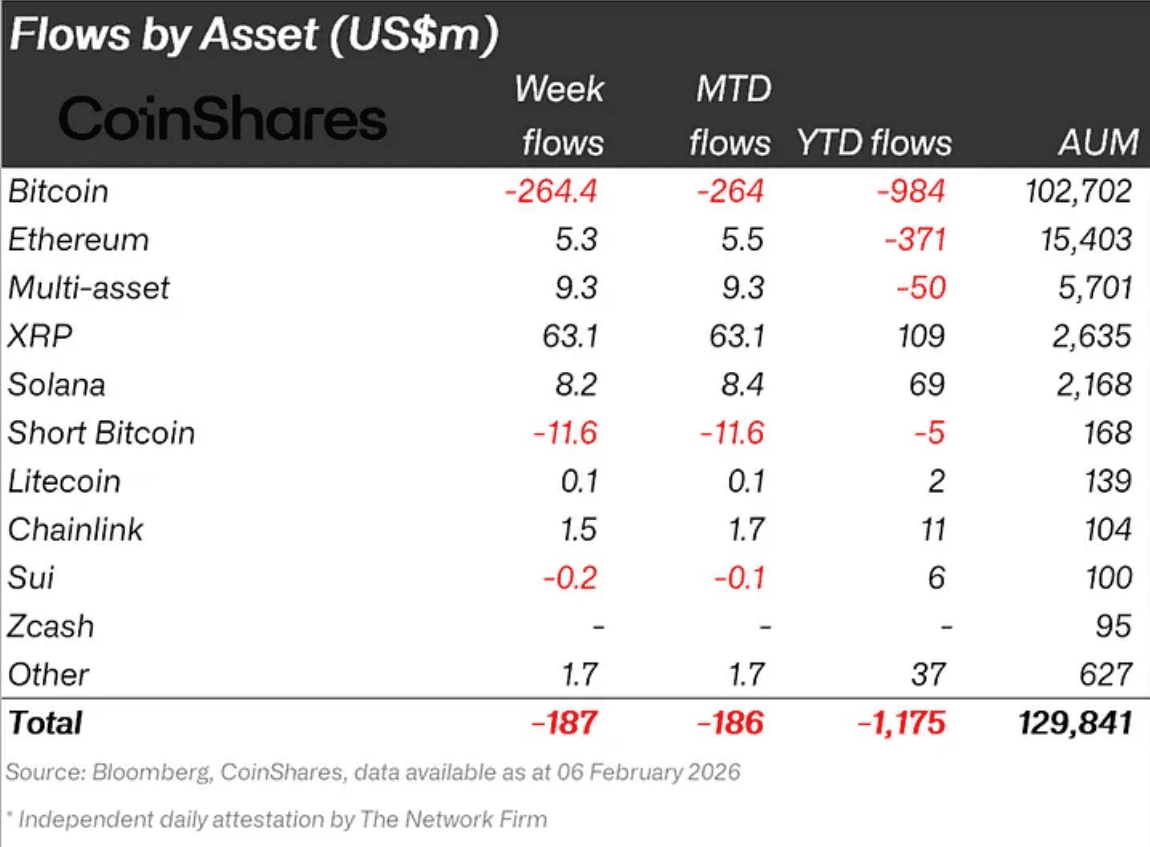 We hebben het dan over de ETF-stromen, waaruit blijkt dat institutionele beleggers nog altijd interesse hebben in de munt van Ripple. Volgens de cijfers van CoinShares wist XRP een instroom van 63,1 miljoen dollar te genereren voor de week van 6 februari.