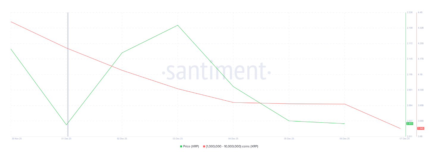Whales zijn beleggers die zeer grote hoeveelheden XRP bezitten. In dit geval gaat het om wallets met tussen de 1 en 10 miljoen XRP. In de afgelopen zeven dagen hebben deze whales samen meer dan 390 miljoen XRP verkocht. Omgerekend komt dat neer op ruim 780 miljoen dollar.