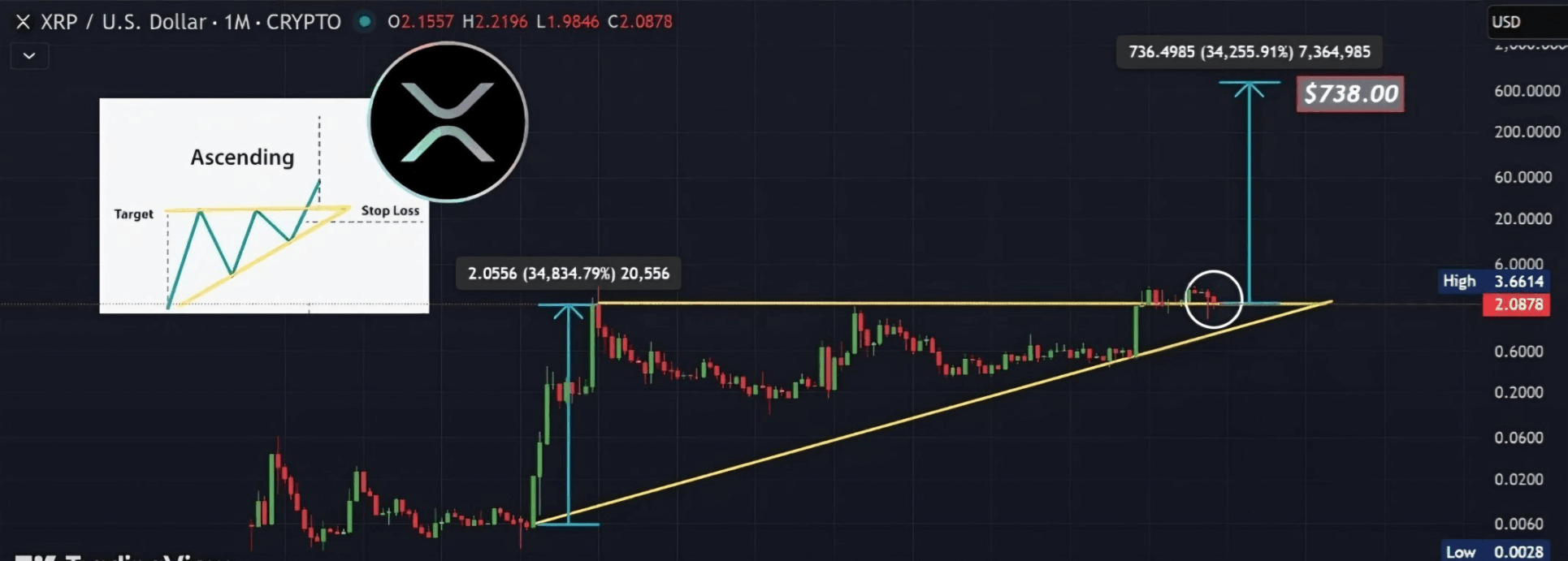 De analist baseert zich op de hoogte van een eerdere uitbraak, waarbij XRP met ruim 34.000 procent steeg. Door datzelfde percentage toe te passen op het huidige patroon, komt hij uit op een theoretisch koersdoel van boven de 700 dollar.