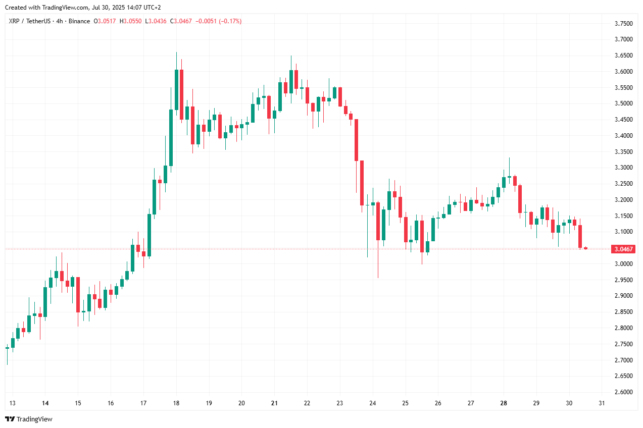 Volgens CoinMarketCap zakte de marktwaarde van XRP van 205,9 miljard dollar op 23 juli naar 180,4 miljard dollar een week later. Een stevige daling van twaalf procent, die niet alleen te wijten is aan winstnemingen, maar ook wijst op een bredere zwakte binnen de altcoinmarkt.