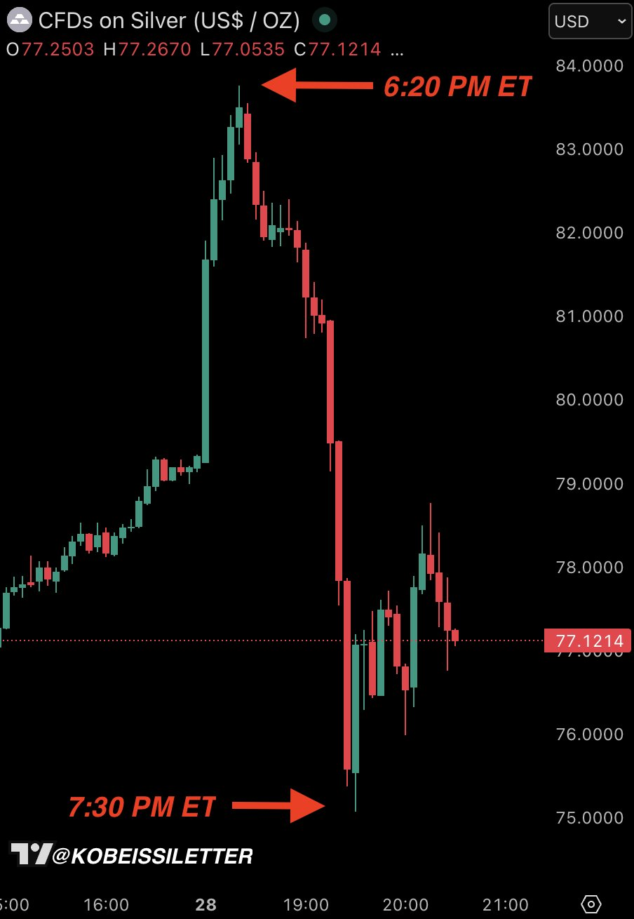 Marktnieuwsbrief The Kobeissi Letter sprak zelfs van “absolute waanzin”. Volgens het platform steeg zilver kort na de opening van de futuresmarkt eerst met 6 procent, om daarna hard onderuit te gaan. Dat tempo doet meer denken aan Bitcoin (BTC) dan aan een traditioneel edelmetaal.