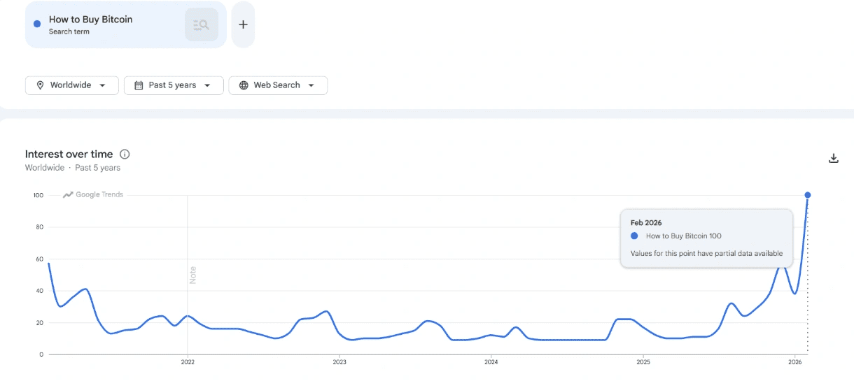 Opvallend is dat deze stijging plaatsvindt kort nadat ook zoekopdrachten als “Bitcoin going to zero” een vijfjarig hoogtepunt bereikten. Dat wijst op een markt waarin zowel angst als hernieuwde interesse tegelijk aanwezig zijn, een combinatie die vaker voorkomt rond belangrijke kantelpunten.