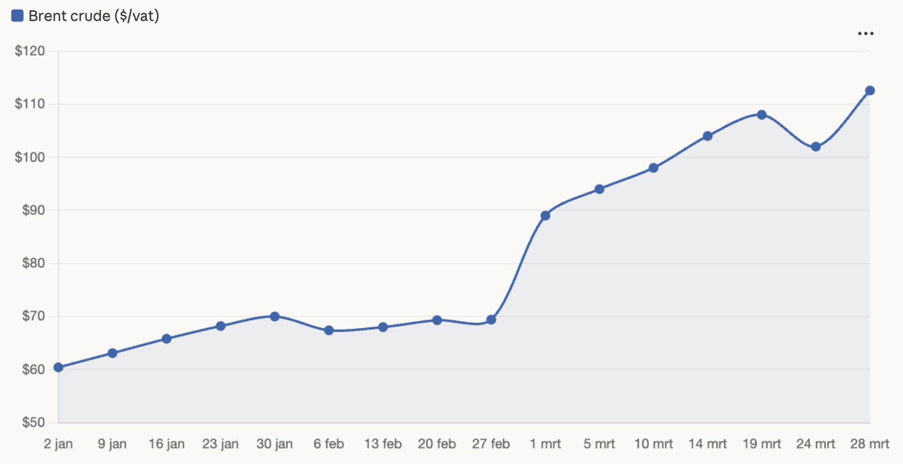 De olieprijs is dit jaar explosief gestegen. Brent-olie steeg van 60,42 dollar per vat op 2 januari naar 112,57 dollar op dit moment, een stijging van ruim 86 procent in minder dan drie maanden. Daarmee is olie veruit de best presterende belegging van 2026.