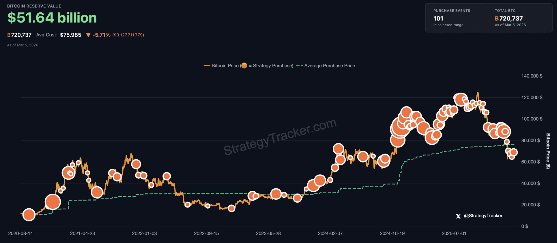 De recente aankoop van 3.015 Bitcoin werd gedaan tegen een gemiddelde prijs van ongeveer 67.700 dollar per munt. Door alle aankopen samen ligt de gemiddelde aankoopprijs van de volledige voorraad inmiddels rond 75.985 dollar per Bitcoin.